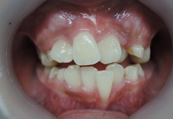 当矯正歯科医院では上顎の乳臼歯にレジンを盛る事で、クロスした前歯の被蓋(前歯の咬み合わせ)を改善していきます。
